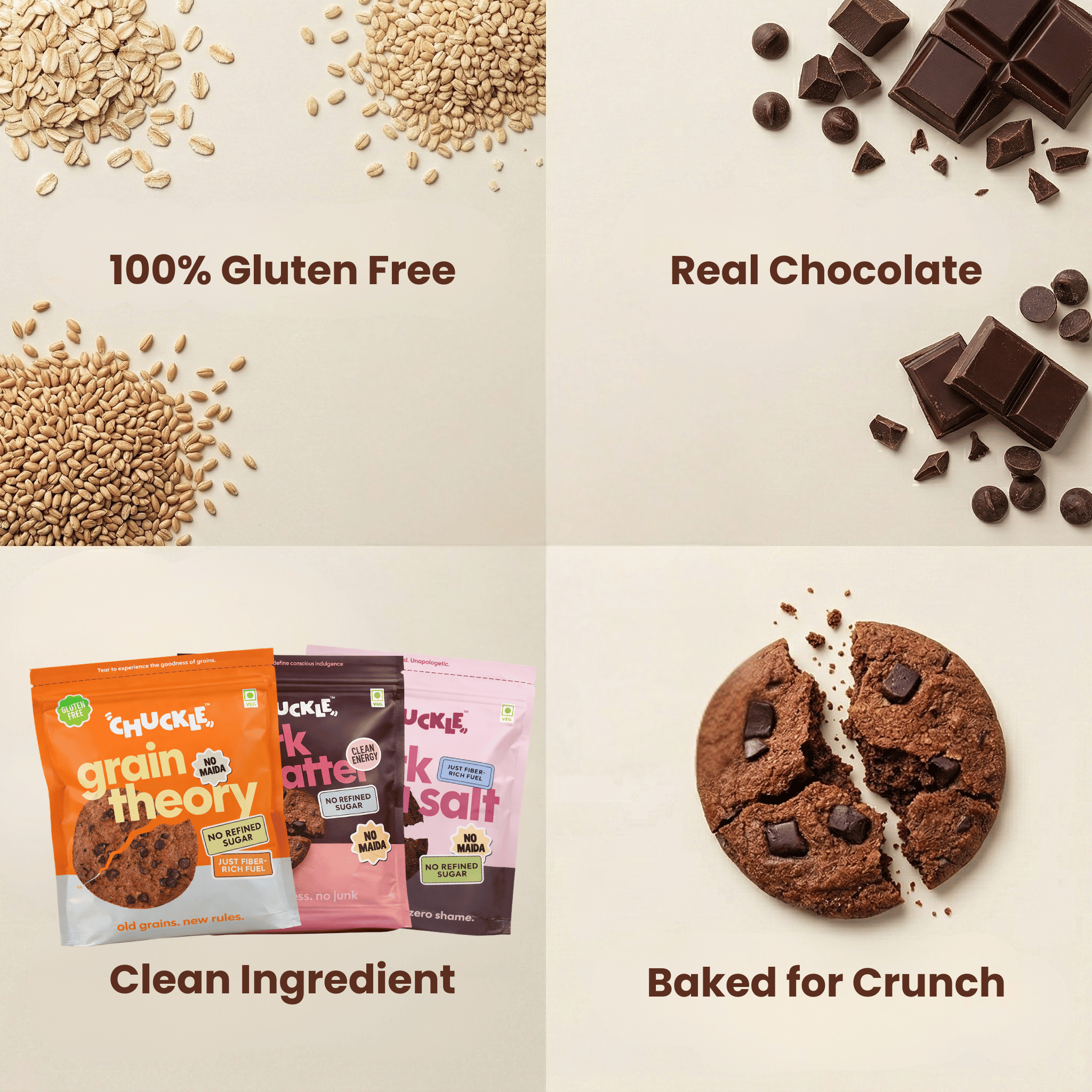 Chocolate chips lead the bite, followed by oats and ragi. Crunchy, real, no preservatives.