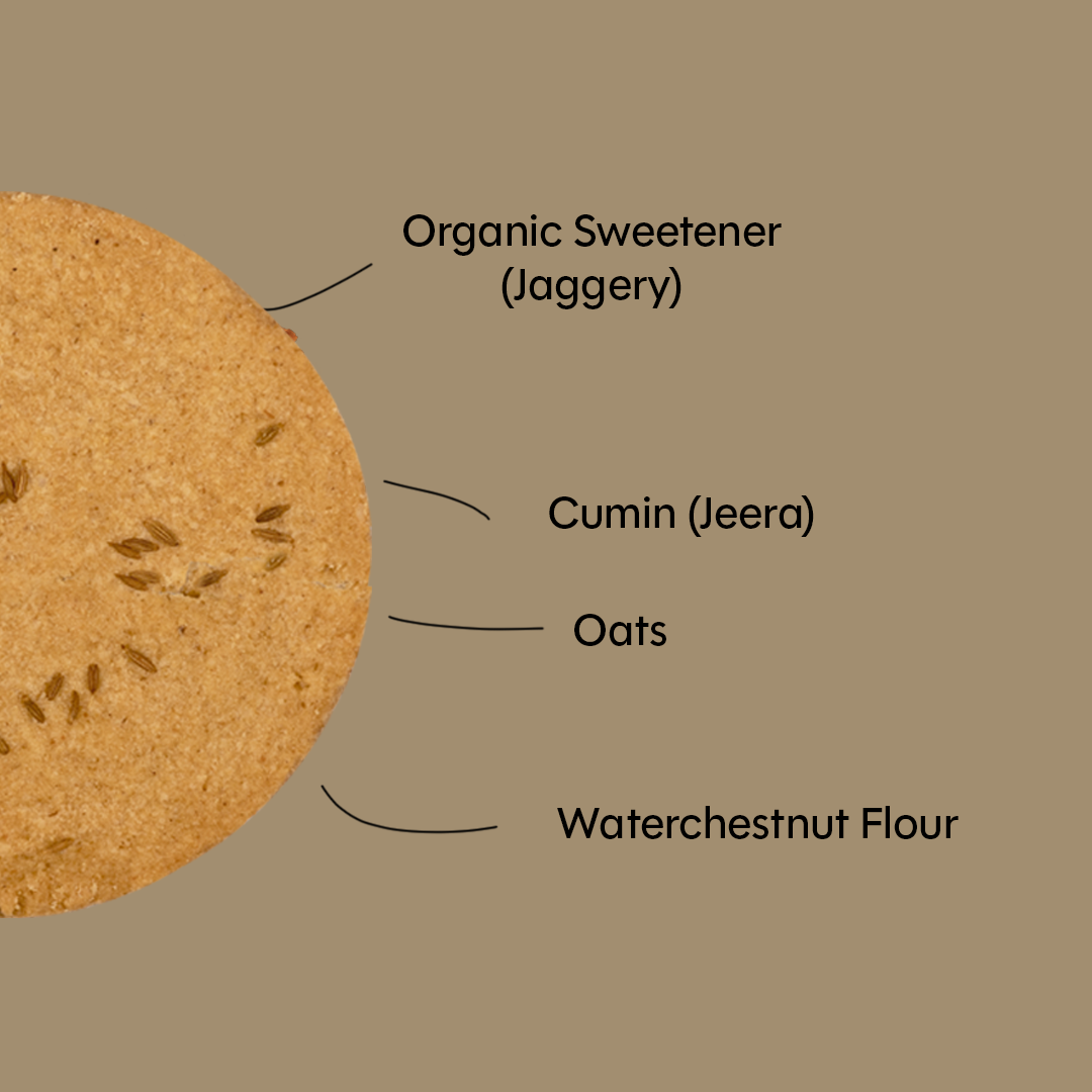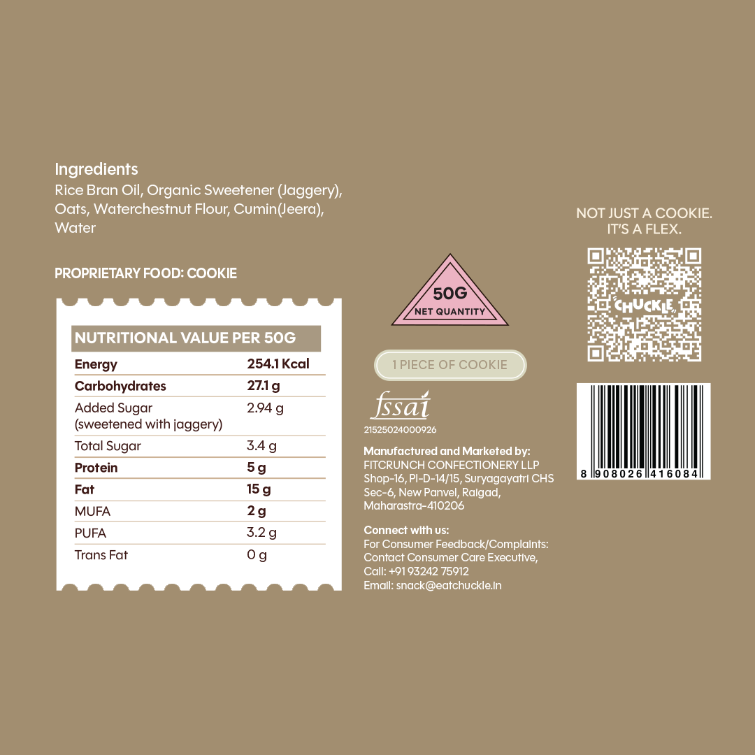 Per Cookie (50g): ~235 kcal, 4g Protein, 11g Fat, 28g Carbs, 2g Fibre
