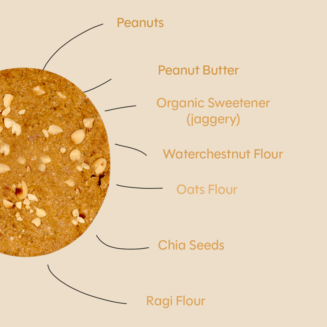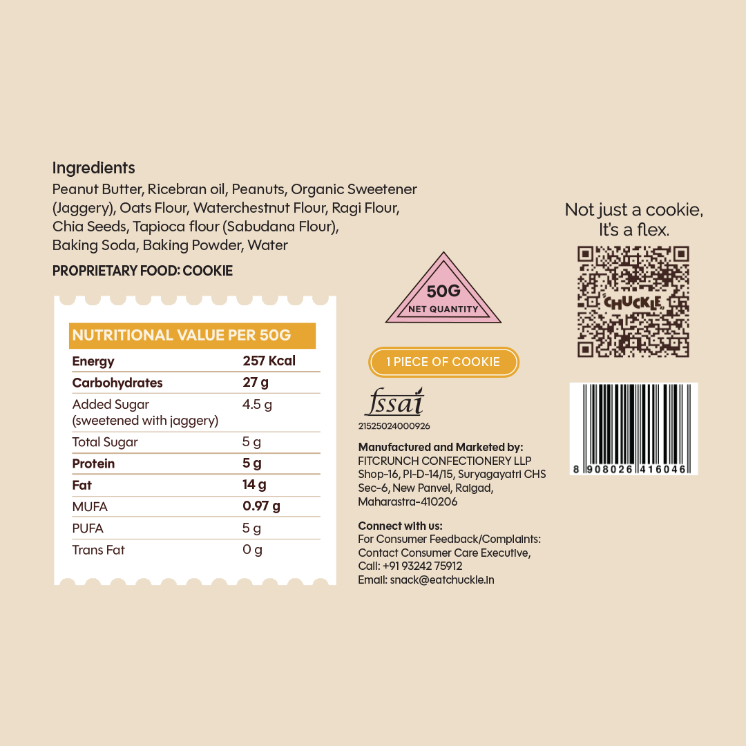 Per Cookie (50g): ~255 kcal, 6g Protein, 13g Fat, 28g Carbs, 3g Fibre